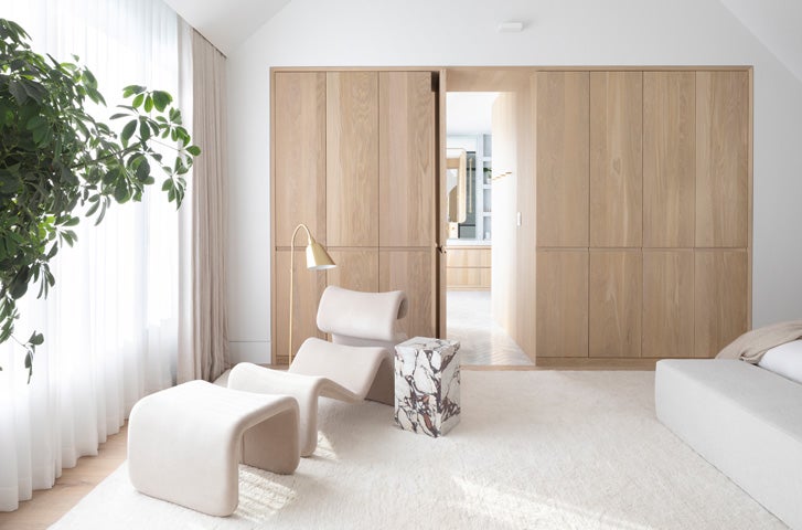 This Andrea Rodman designed bedroom features a whole wall of closets, but one of the doors reveals a little bit more… the entrance to the ensuite. “We were trying to figure out how to incorporate the door with the awkward gable ceiling: this blends it in and creates symmetry,” says Rodman.