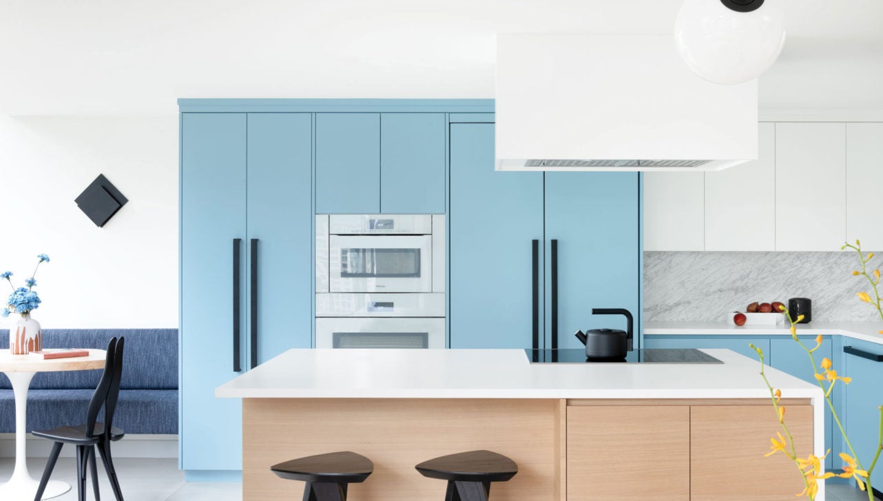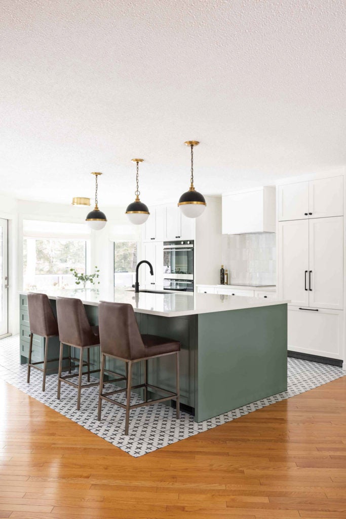 On the same note as using large washes of one colour, the kitchen island is a great place to start implementing this rule! Designers Aly Velji and Alison Connor from Alykhan Velji Designs had this in mind when designing this Calgary home. They incorporated colour without compromising the clean look of the trendy all-white kitchen.