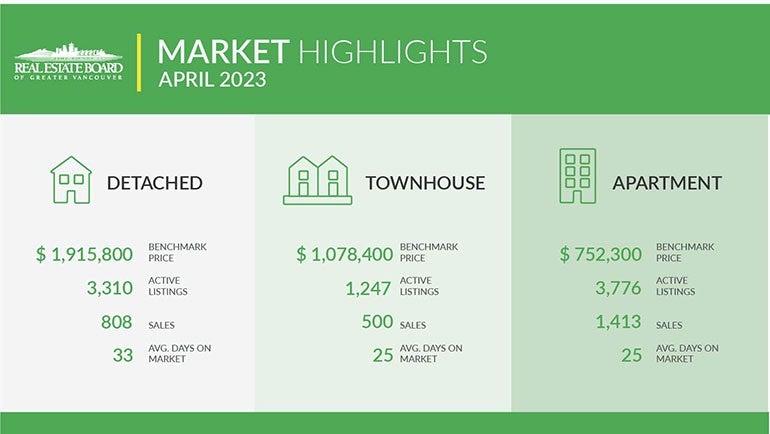Across all detached, attached and apartment property types, the sales-to-active listings ratio for April 2023 is 32.7 per cent. By property type, the ratio is 24.4 per cent for detached homes, 40.1 per cent for townhomes, and 37.4 per cent for apartments.
