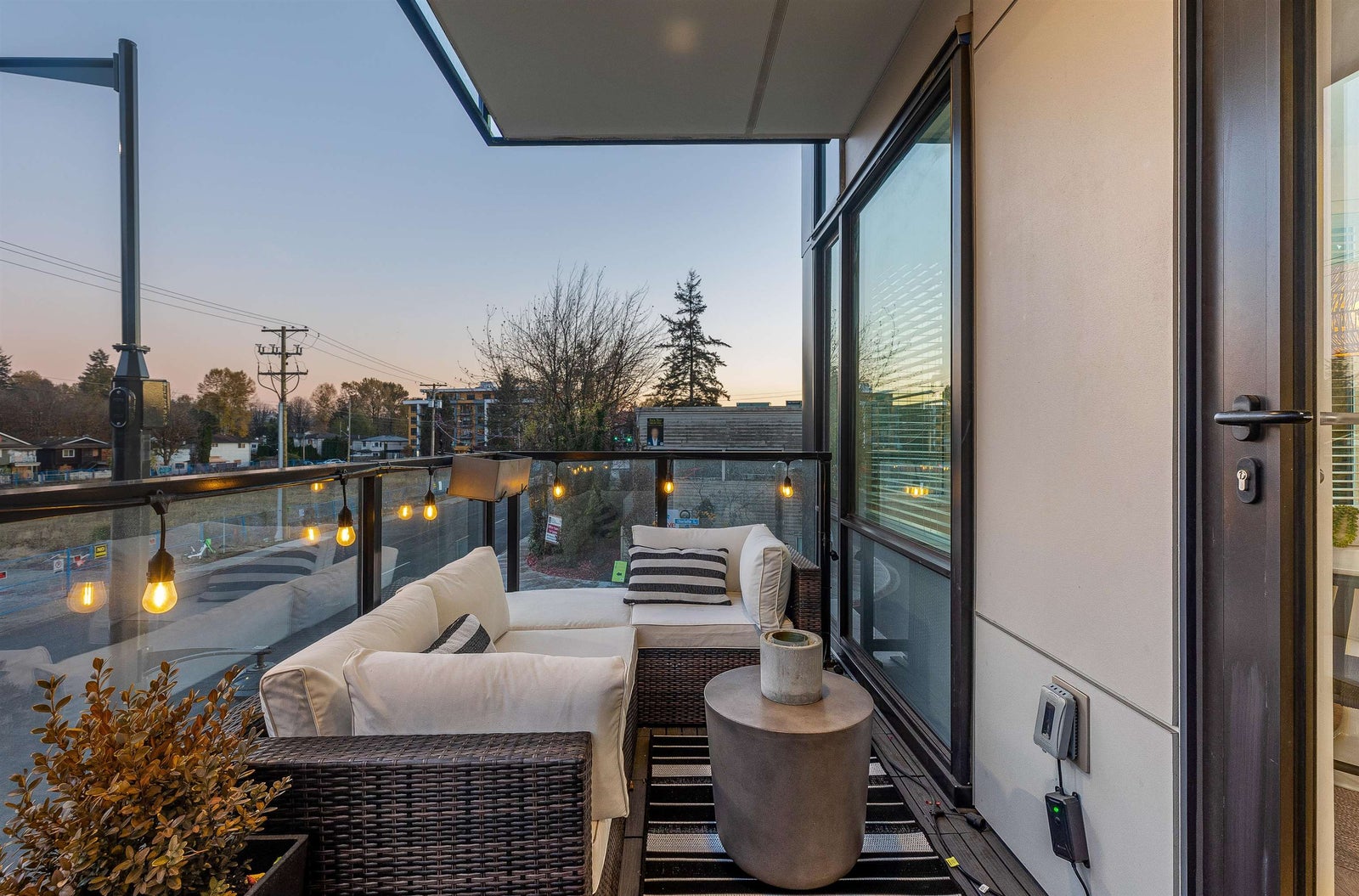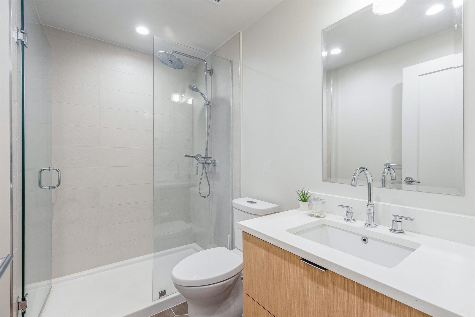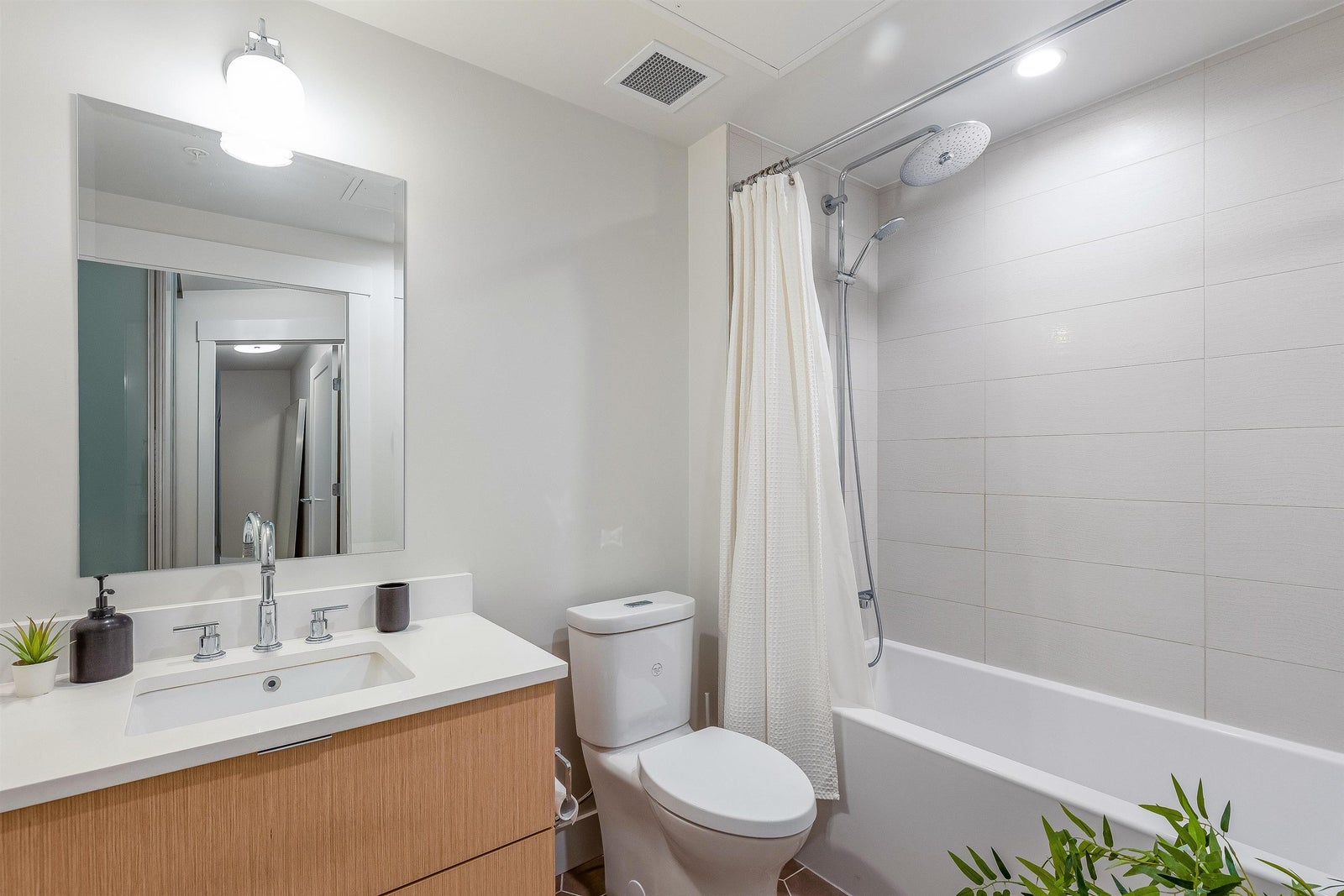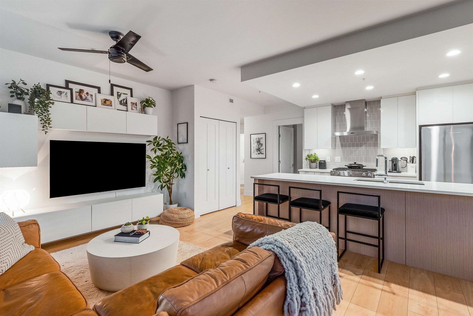 A SPECTACULAR SE 2 Bed + 2 Bath + Den CORNER UNIT AT BROOKLYNN. Immaculately kept; this incredibly spacious 1,040 SF home boasts a brand new feel with warranty included, radiant in floor heating, home office or den & open concept living with oversized windows for natural light! The floorplan is masterly laid out, with an extra large kitchen, built in pantry & entertainment sized island. The covered patio is ideal for BBQ's + entertaining. This is a unique offering as BrookLynn's 1,500SF open-air courtyard is a great casual community space with striking design by Francl Architecture. Situated in the heart of the emerging Lynn Creek Town Centre with a newly remodelled Park, river trails, breweries, cafe's & many more 27,000 SF amenities coming soon. 1 EV ready parking & storage.