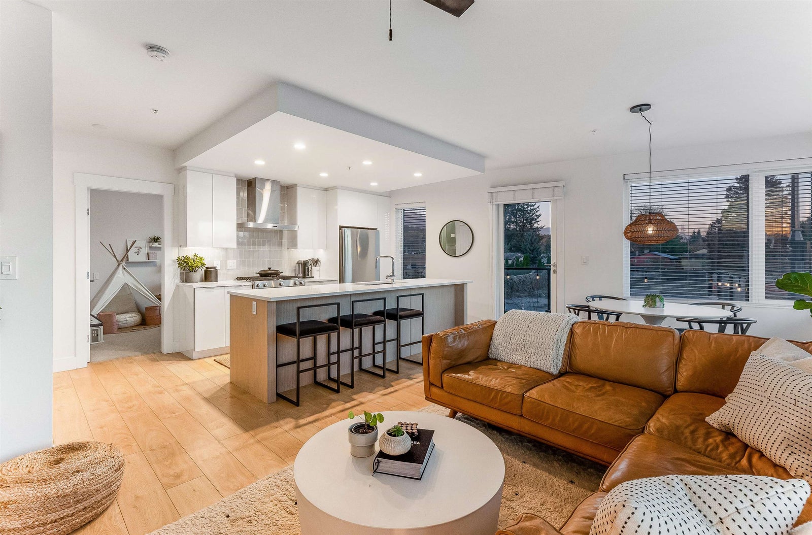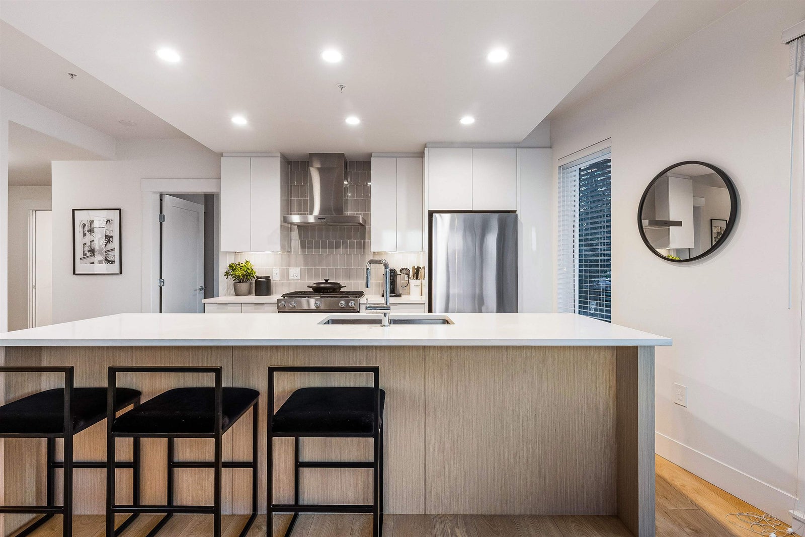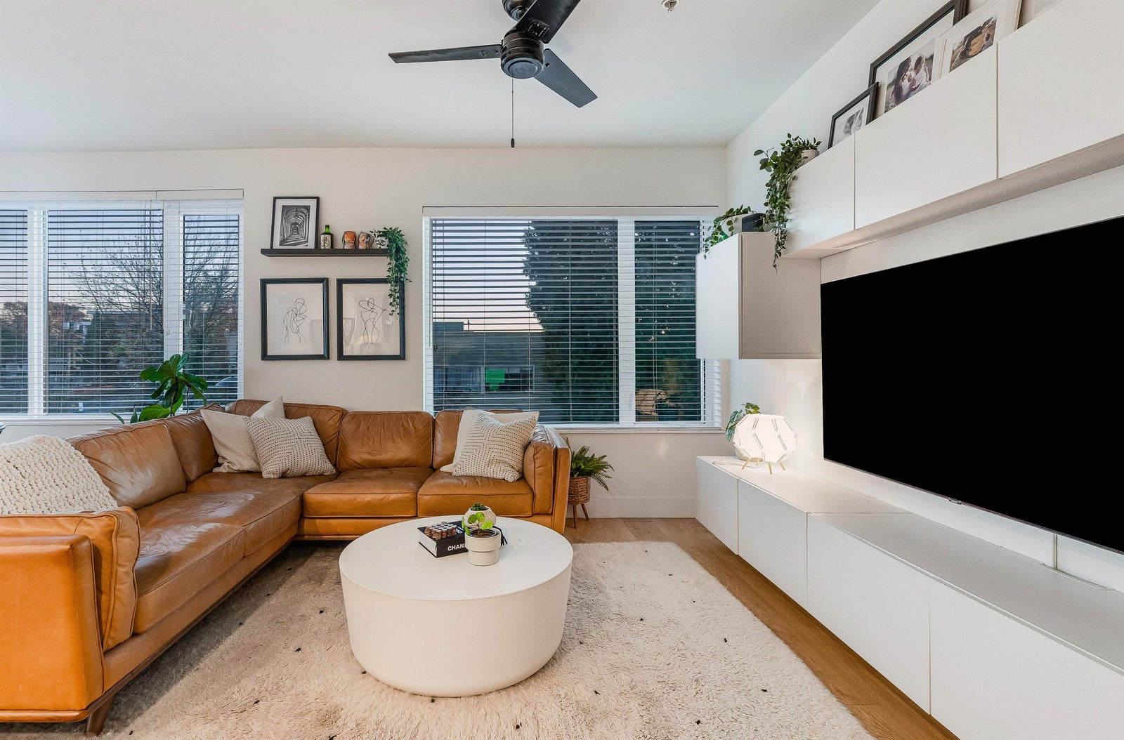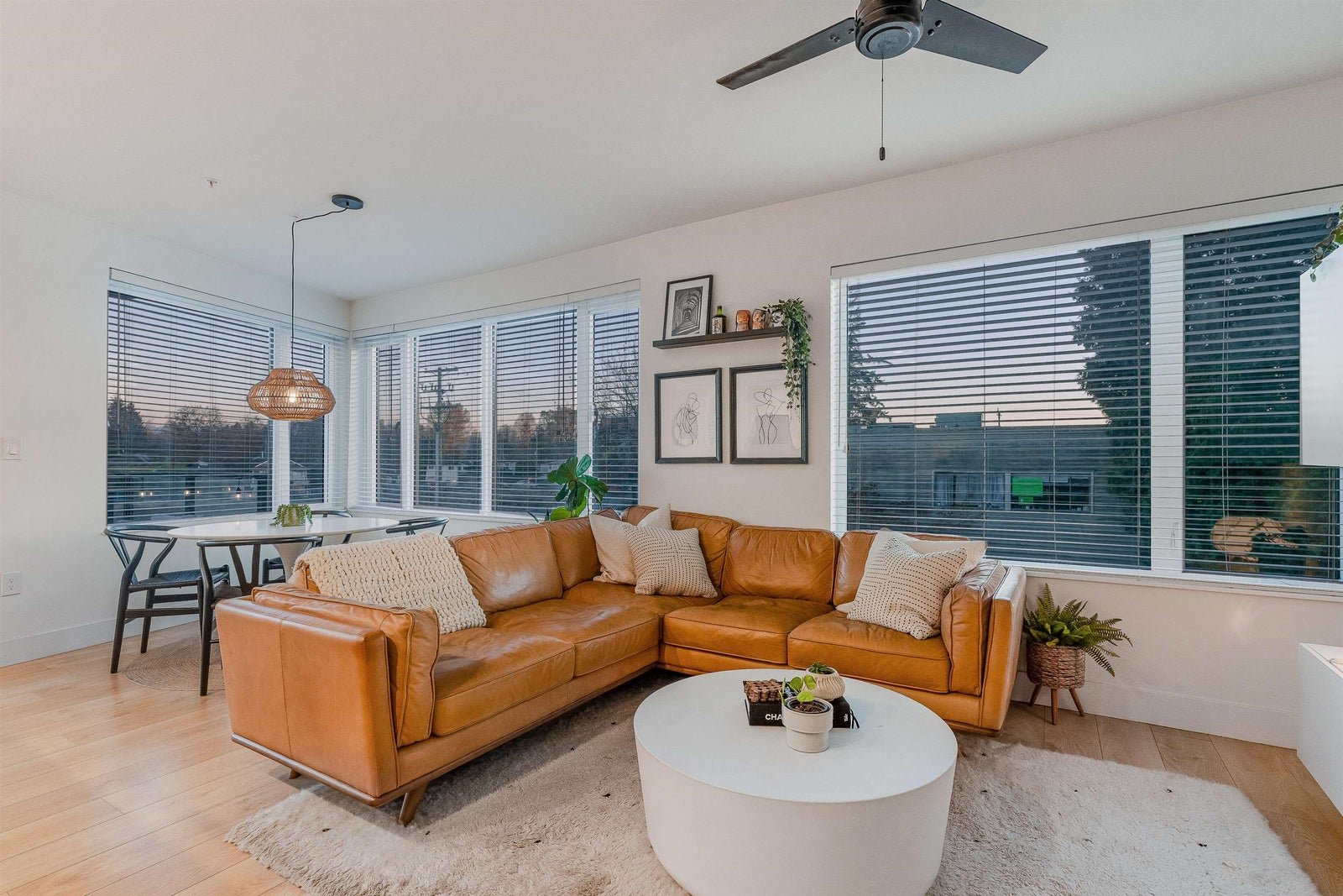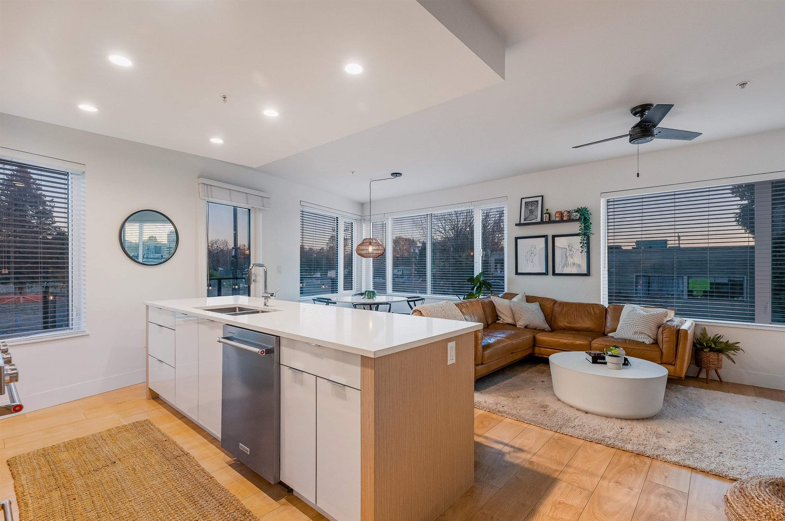 A SPECTACULAR SE 2 Bed + 2 Bath + Den CORNER UNIT AT BROOKLYNN. Immaculately kept; this incredibly spacious 1,040 SF home boasts a brand new feel with warranty included, radiant in floor heating, home office or den & open concept living with oversized windows for natural light! The floorplan is masterly laid out, with an extra large kitchen, built in pantry & entertainment sized island. The covered patio is ideal for BBQ's + entertaining. This is a unique offering as BrookLynn's 1,500SF open-air courtyard is a great casual community space with striking design by Francl Architecture. Situated in the heart of the emerging Lynn Creek Town Centre with a newly remodelled Park, river trails, breweries, cafe's & many more 27,000 SF amenities coming soon. 1 EV ready parking & storage.