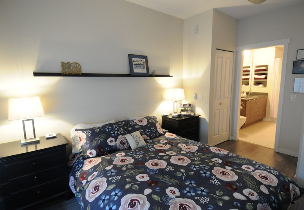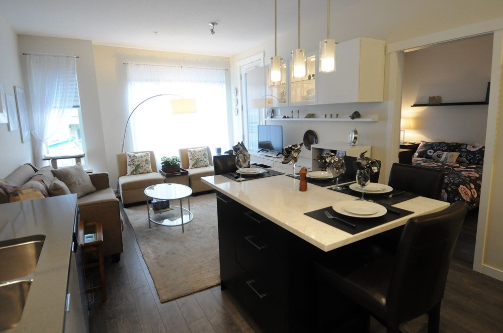 Welcome to Canyon Springs! Attractive one bed and office/flex room unit situated on quiet side of this unique West Coast inspired building designed by Ray Letkeman Architects. Impressive open plan with airy nine-foot ceilings creates a bright & spacious living room with gourmet kitchen featuring custom built quartz dining room sized island, sleek stainless steel appliances by Whirlpool and Fisher & Paykel makes entertaining a breeze. Other features of this lovely home include durable flooring, low E' large double glazed windows, spa inspired 5 piece ensuite, functional custom built-ins and your own private balcony. Beautifully appointed lobby/lounge with cozy fireplace, fitness studio, courtyard, bike storage, dog wash area. Walk to shopping, restaurants, recreation and more! Open Sat. 2-4