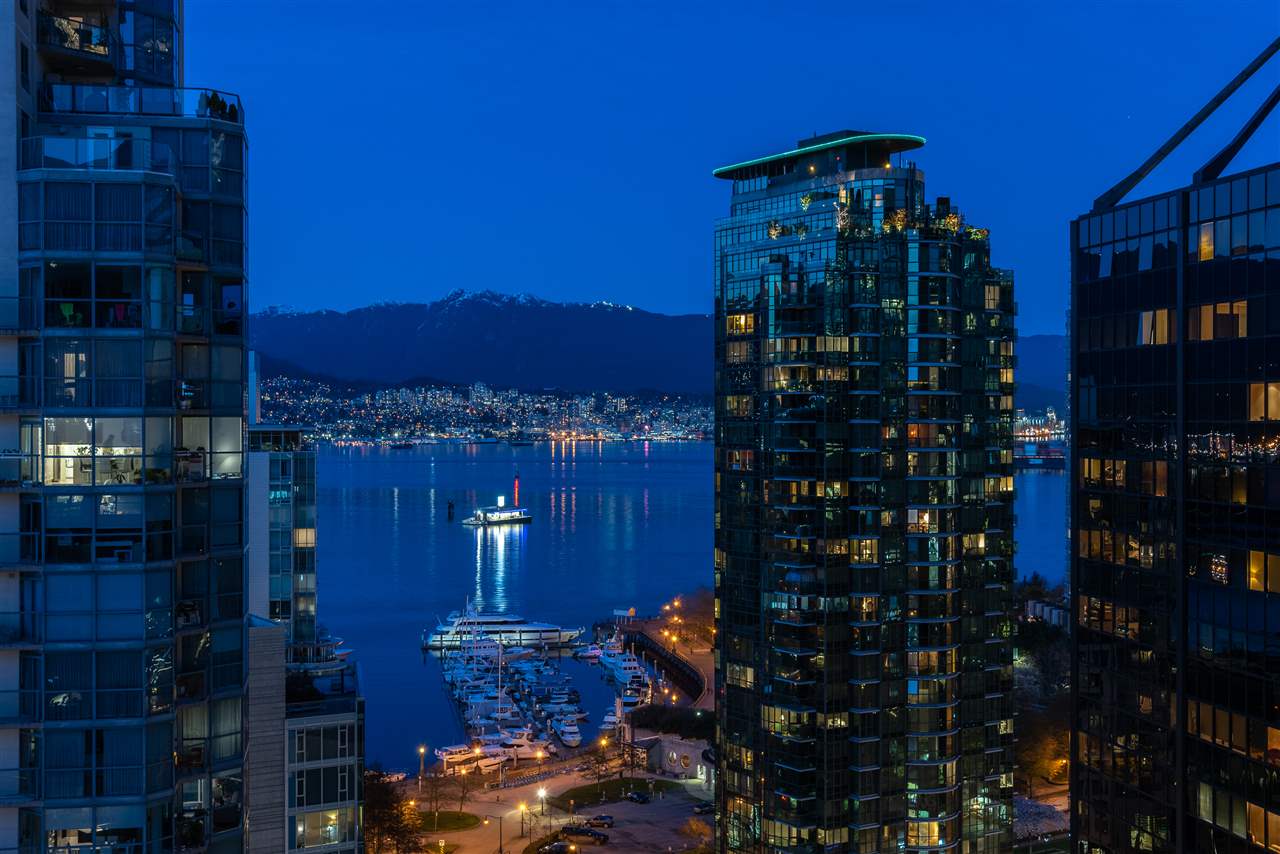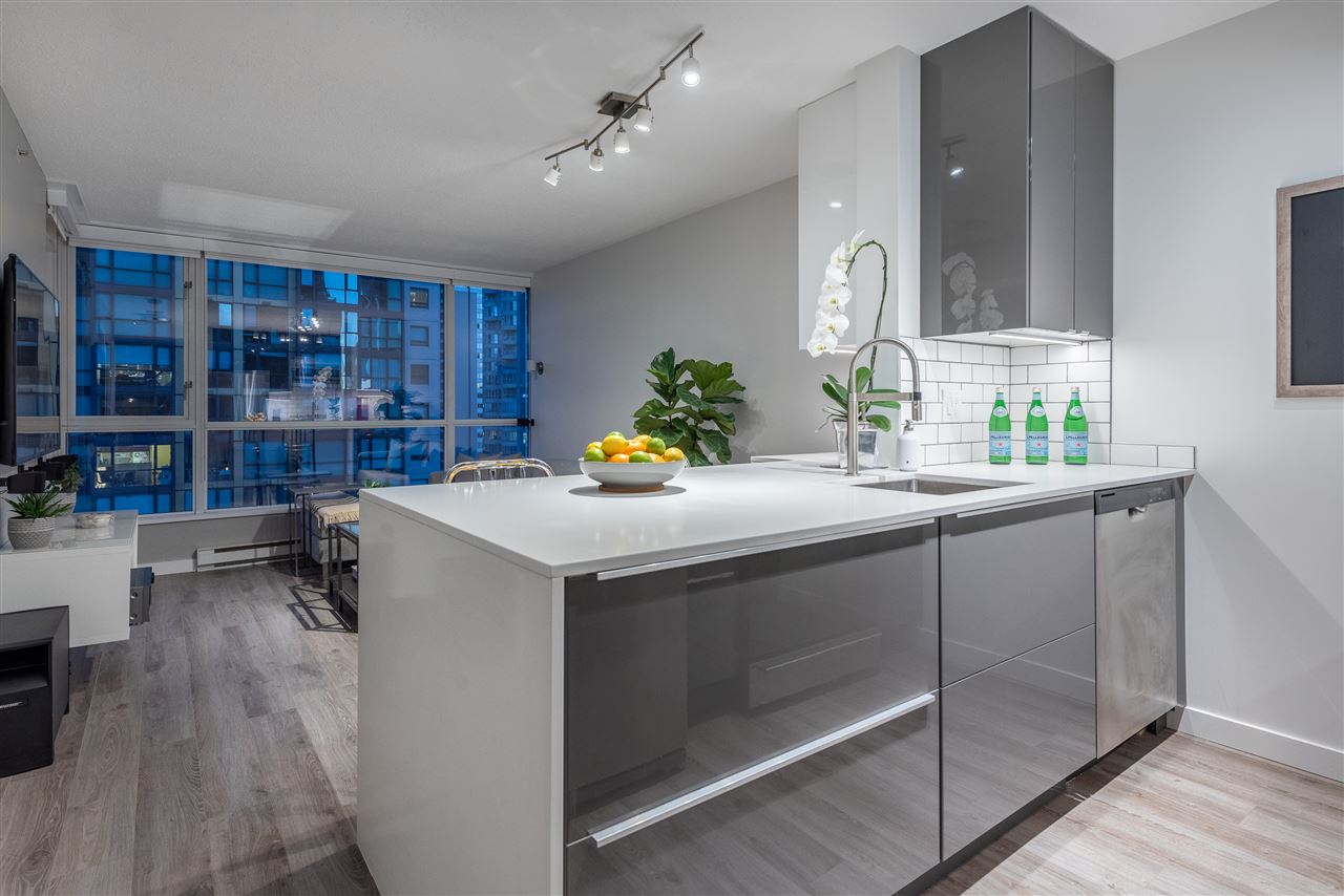 ONE-OF-A-KIND residence at the GEORGE. This fully renovated 1 bed + den exudes modern sophistication with UNOBSTRUCTED panoramic water + city views. Featuring over $50,000 in custom upgrades this stunning kitchen will appeal to the most discerning of chefs; imported quartz countertops + waterfall island and an integrated bar leading to your wine fridge with updated S/S Appliances. Your spa bathroom rivals those of 5 star luxury hotels, including a built-in 19†TV, Toto heated toilet + custom lighting throughout. New roller blinds and built-in cabinetry in your WALK-IN closet complete this home. Enjoy your fully equipped GYM and amazing area amenities just steps to Robson, Coal Harbour a myriad of shops and restaurants. This one has it all!