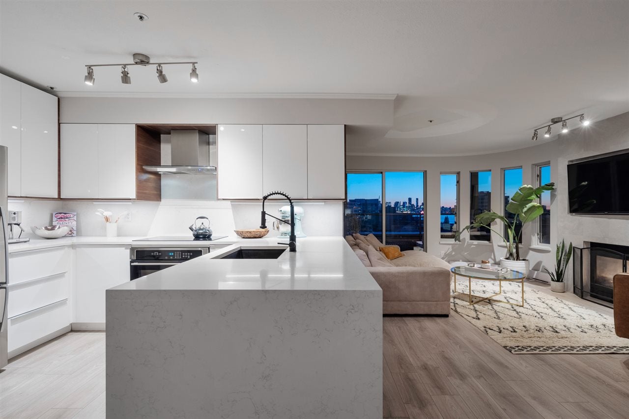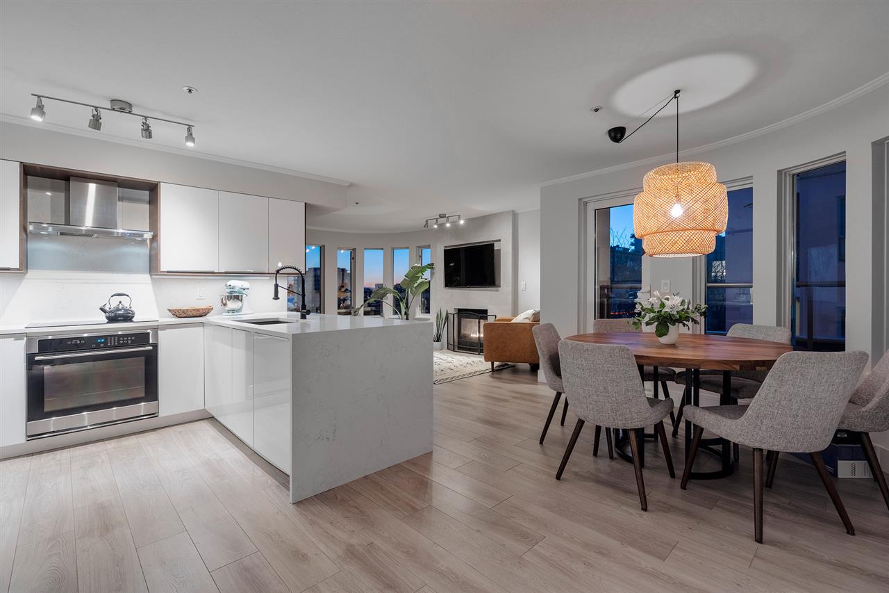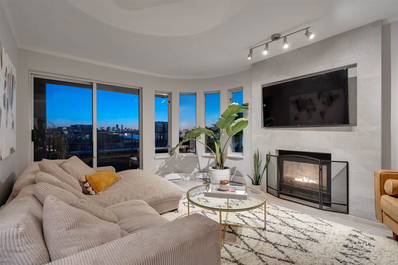 Very rare listing in The Evergreen, a boutique residence in the heart of Lower Lonsdale. This fully renovated 2 bed, 2 bath home offers an expansive 1,123 square foot layout and an additional 414 sq.ft. over two separate patios! The home boasts a very spacious, open concept kitchen/ living/dining space with expansive south-facing views of Downtown Vancouver and Burrard Inlet. Features include gas fireplace,SS appliances, quartz counters, oversized master bedroom that fits a king with built-in closet organizers, and spa-like ensuite/2nd bath with Nuheat. Entertain guests or cuddle up for an evening of relaxation from your oversized terrace! Ideally located steps to the Seabus and countless shops and restaurants.