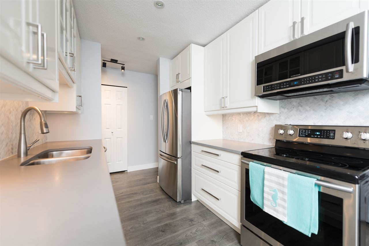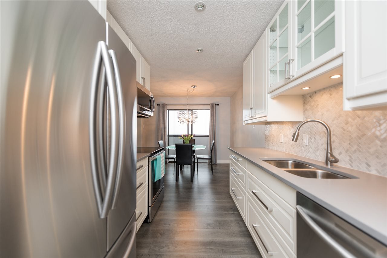 A spectacular renovation in this spacious bright SE corner unit in the heart of Upper Lonsdale. Featuring 975 SF, 2 bedrooms on opposite ends, 2 baths, sleek concrete quartz countertops, new kitchen cabinets, Samsung appliances package, in suite laundry, rain shower, nu-floor heating, and an amazing enclosed patio with enormous sliding windows to allow continuous air flow. Freshly painted throughout, new window treatments/coverings will make you feel right at home. Cozy up to your wood burning fireplace (electric insert also available). Pets allowed. Building offers a storage locker, 1 secured parking, party room, & workshop. The Coventry House is close to all amenities and transit. OPEN SUN, 1-4PM.