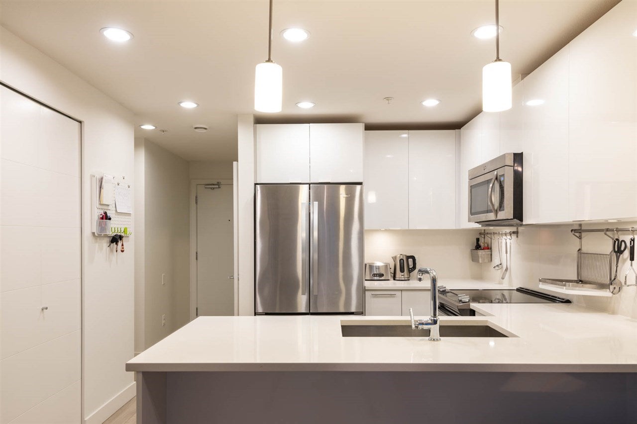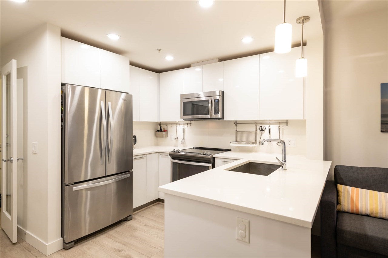FANTASTIC 1 Bedroom + Den at The Shore, one of Adera’s premier North Shore developments. A private suite, featuring a bright 617 sq ft open concept living floor-plan with stainless steel appliances, upgraded fixtures & glass doors, modern cabinetry, quartz countertops, black out blinds, and radiant in floor heating. This highly desirable & functional plan is complimented with a large 128 sq ft patio, perfect for entertaining and summer BBQing. Just steps away from the North shore Spirit Trail, easy access to transit, SeaBus & close to some of the best restaurants/shopping North Vancouver has to offer. Includes 1 Parking, 1 Storage Locker & balance of a 2-5-10 Warranty. Pets and rentals are welcomed.