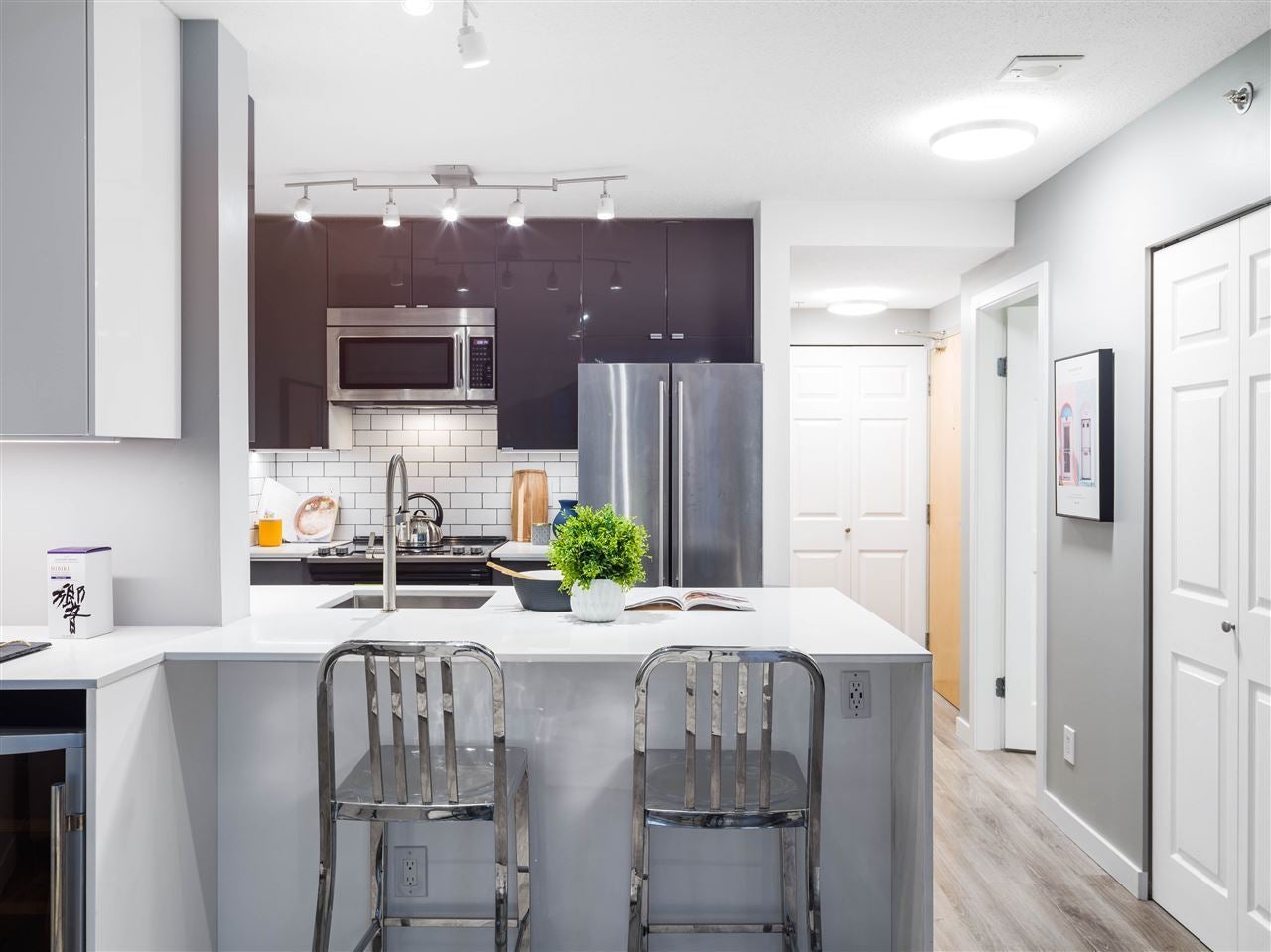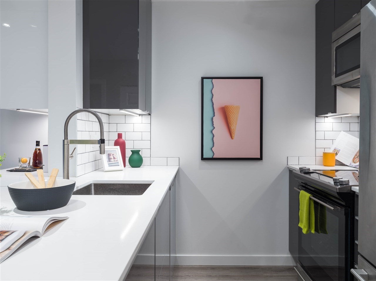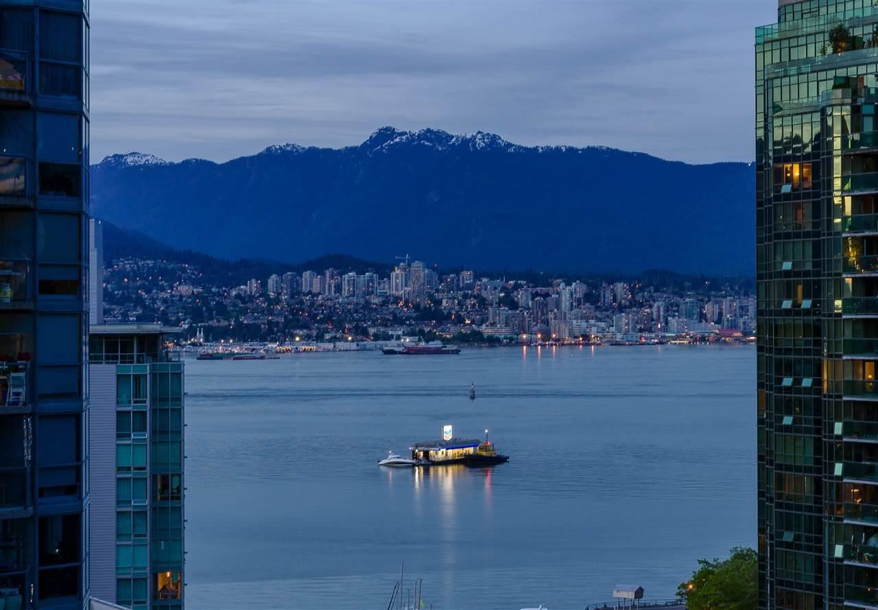 STUNNING residence at the GEORGE. This fully renovated 1 bed + den has UNOBSTRUCTED panoramic water + city views. Featuring a full renovation with a stunning kitchen; imported quartz countertops + waterfall island and an integrated bar leading to your wine fridge with updated S/S Appliances. Spa like bathrooms, including a built-in 19†TV, Toto heated toilet + custom lighting throughout & washer and dryer. New roller blinds and built-in cabinetry in your WALK-IN closet complete this home. Enjoy your fully equipped GYM and amazing area amenities just steps to Robson, Coal Harbour a ton of shops and restaurants. This one has it all! Rentals allowed - 6 month min. A fantastic building with a huge Contingency fund! Parking Included. AVAILABLE, OWNER OCCUPIED- Move in soon.