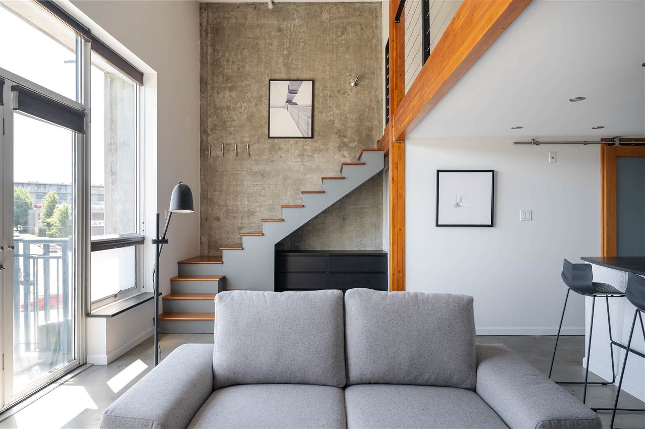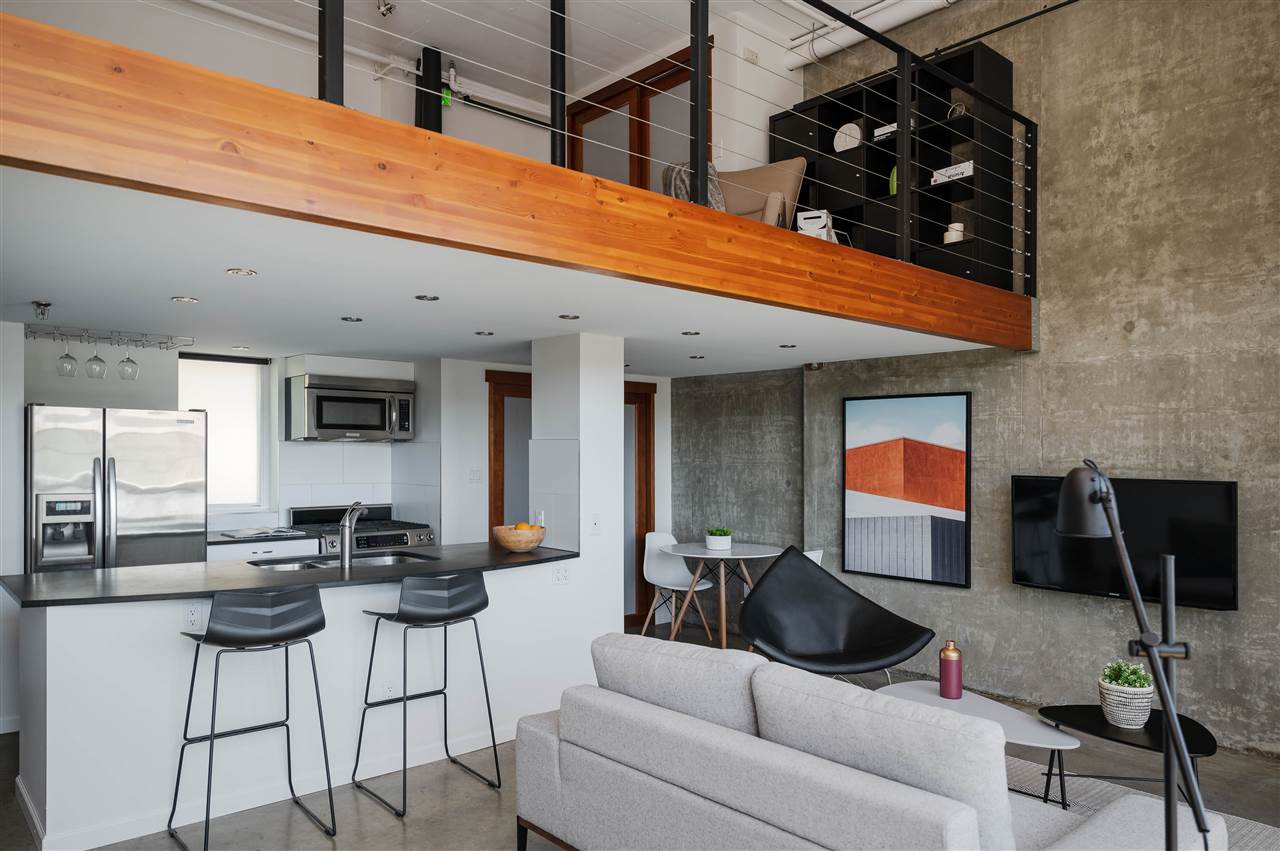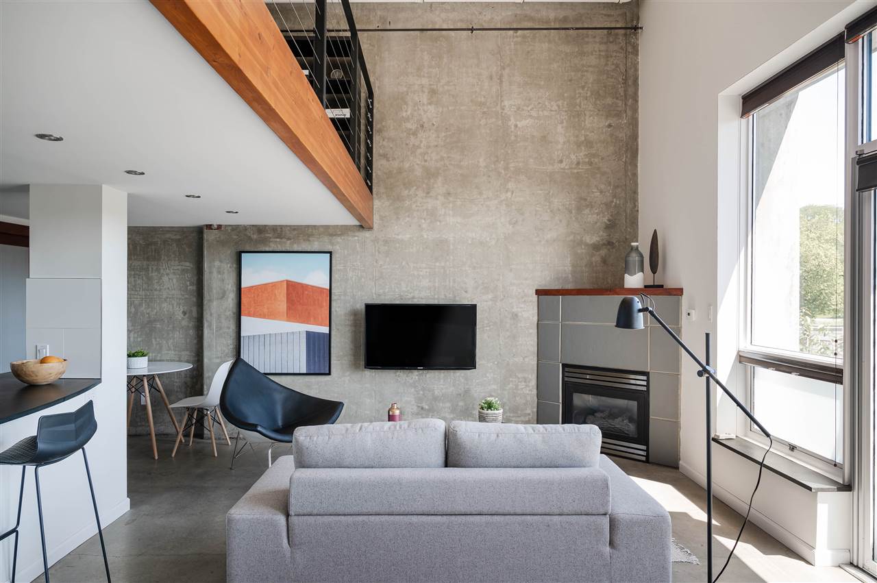 LOFT LIVING at Cannery Row. Featuring stunning 15’ ceilings, open concept living, architectural concrete finishings throughout, hot water on demand, cozy gas fireplace, totally updated - this space will impress! Enjoy the concrete building in a well ran strata with a roof top deck, perfect for summer entertaining overlooking the beautiful North Shore mountains and water - Capture the sunsets while BBQing! lThis large and bright 2 level loft is an excellent investment positioned on the quiet side of the building with a unique open courtyard entrance. Upstairs has a large open bedroom and reading area with exposed wood beams! Walking distance to a lot of great coffee shops, places to eat, and local craft breweries such as Parallel 49 Rentals and pets allowed.