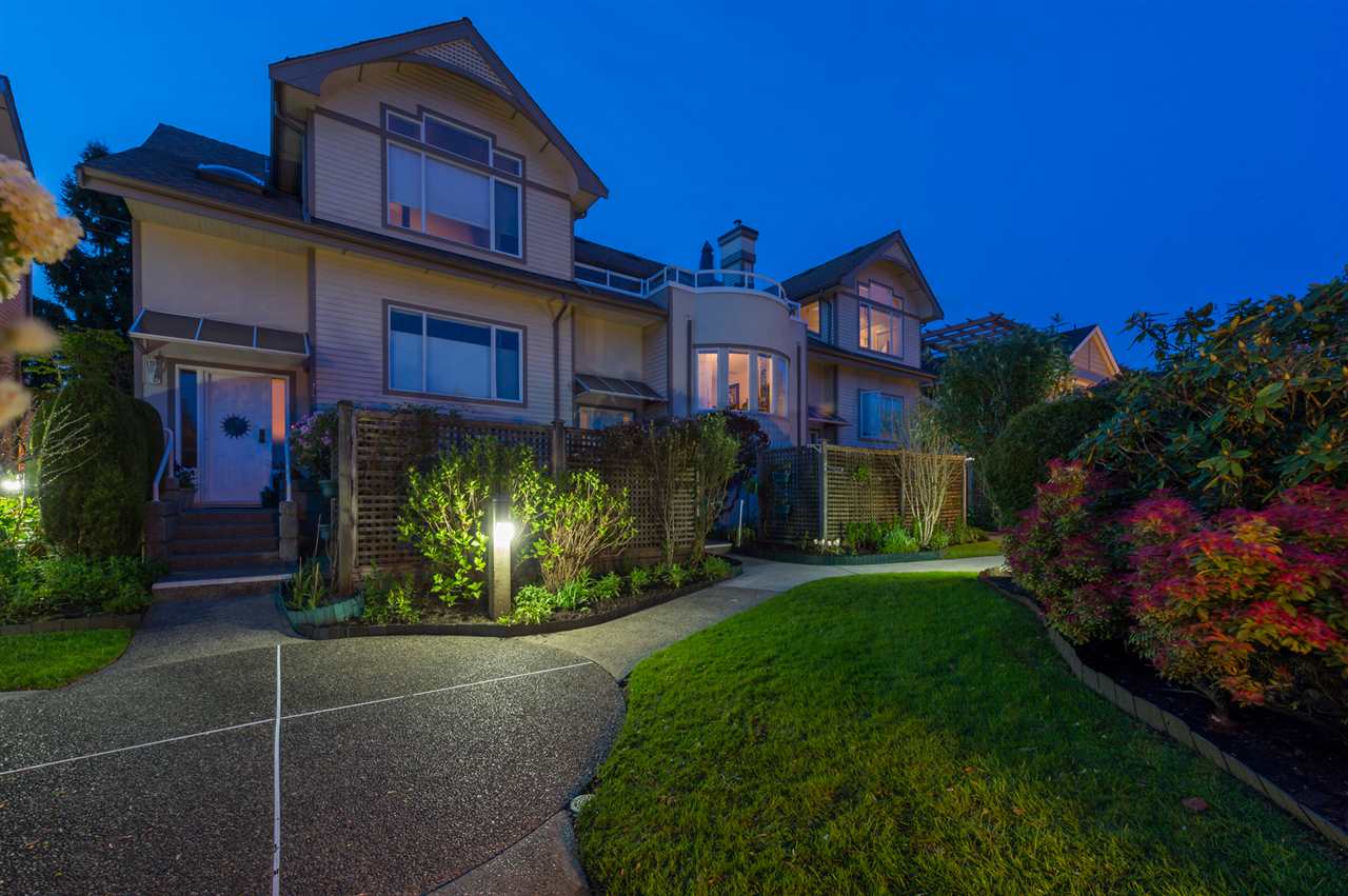 A spectacular 1750 SF townhouse in popular Central Lonsdale. One of the largest 2 bdrm + den + rec room featuring expansive room sizes, gas fireplace, private patios, loads of storage and direct access to secured parking. The main floor offers loads of natural light with an open living/dining room complimenting the kitchen, down features 2 large bedrooms with ensuites and the basement has a massive rec room (3rd bed potential) and tons of storage. Easthill is a gated complex of 14 units with beautiful lush gardens & pride of ownership evident. You will love this very attractive and well maintained home. Located within walking distance to shopping, transportation and parks. This one has it all.