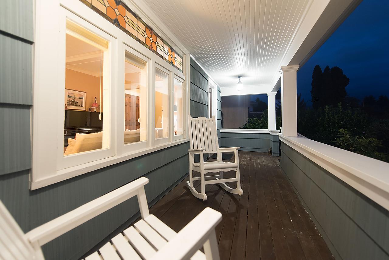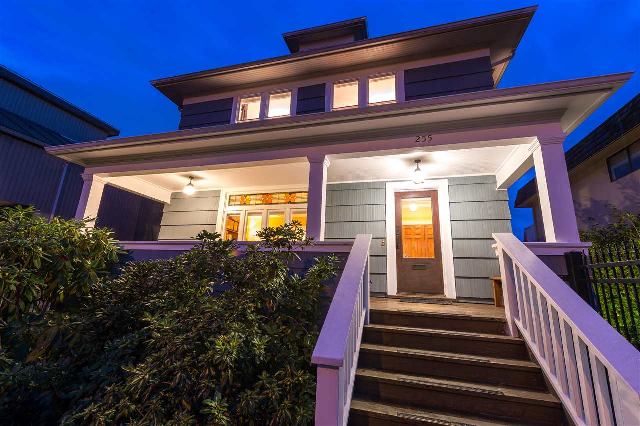 A SPECTACULAR 1911 Edwardian heritage view residence totally architecturally built in 2006. This upper 2/3 2,550 SF duplex has sensational 360 degree views of the harbour, city Lions Gate & mountains. Completed with covered verandas, 9 ft ceilings, fir & oak flooring throughout, stained glass, Low-E windows, formal living with original fireplace, formal dining with pocket doors, gourmet kitchen, granite counters & island, window seat, walk-in pantry, 3 baths, 2 car garage/carport, manicure private gated yard, & a large bright family room. The upper level has 4 spacious bedrooms with fabulous views & a walk in laundry room. The top rec room/office/flex space features ample storage with a beautiful private roof top deck.