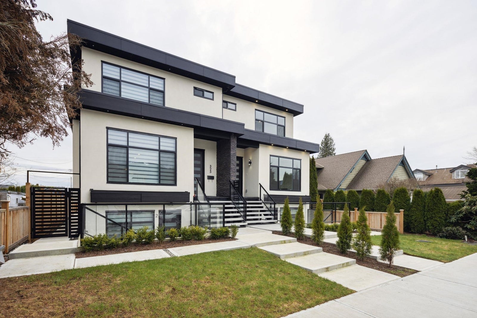 Located on a prime block of Central Lonsdale is this well-built and thoughtfully designed side by side duplex. Enter to a spacious main floor destined for entertaining! The gourmet chef's kitchen w/ massive island & bar seating is saddled by the large living area w/ fp at the front & dining + family room that open to a covered South facing deck w/ room for lounging and dining year round. Upstairs has 3 large bedrooms including the primary w/ WIC, private ensuite & sundeck with downtown views. Laundry & another full bath complete this floor. Down has a rec room/4th bedroom and 3 piece bath for the owners use plus a separate self-contained legal 1 bedroom suite. Lovely curb appeal, south facing fenced backyard, single garage, extra open parking, heat pump/AC & more. NO GST!