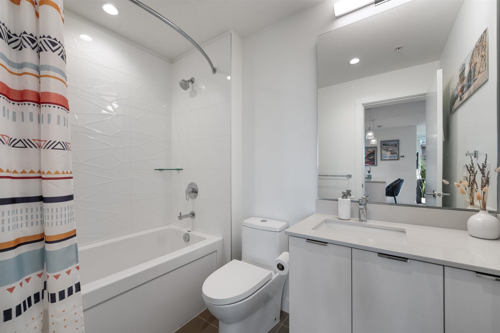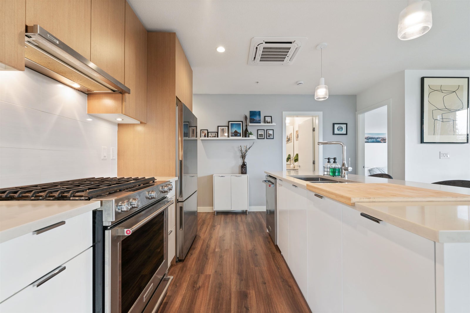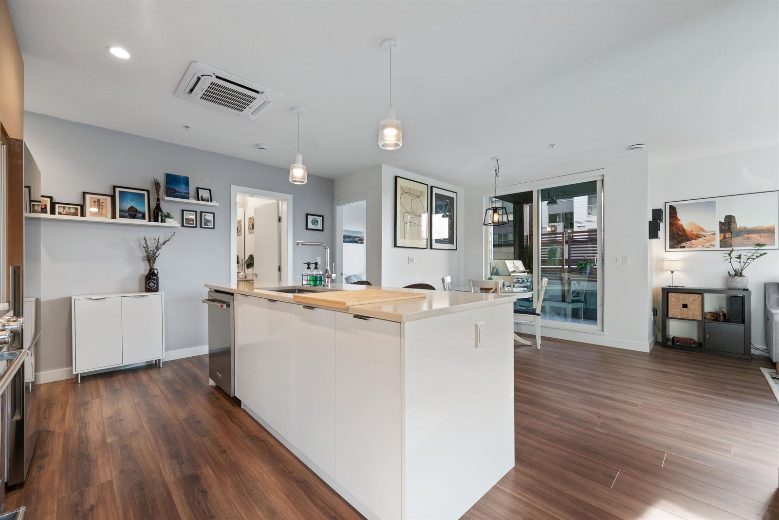 A STUNNING 3 BEDROOM CORNER UNIT, Welcome to Crest. This single-level 1,030 SF residence offers bright, open-concept living and a true standout feature: an impressive 375 SF covered private wrap-around balcony designed for year-round use, ideal for BBQing, gardening, and relaxing in any season. The gourmet kitchen is appointed with quartz countertops, premium stainless steel appliances, and sleek fixtures that flow seamlessly into the spacious south-facing living and dining areas, highlighted by peek-a-boo ocean views. Completed in 2021, this award-winning development is constructed with SmartWood® innovation and cross-laminated mass timber, delivering a sustainable, sound-dampening build. Residents also enjoy premium amenities, including a fully equipped gym. OPEN SAT 2-4 PM
